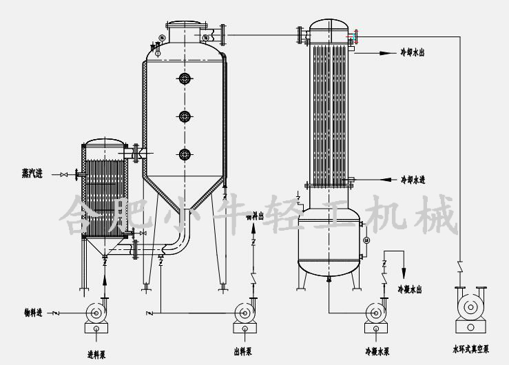 單效外循環(huán)蒸發(fā)器(單效濃縮器)在工作時,濃度較低的稀料液由進(jìn)料泵或利用真空自吸的方法進(jìn)入加熱器的管程,鍋爐高溫蒸汽進(jìn)入加熱器的殼程,蒸汽對管程內(nèi)的料液間接性加熱,料液受熱后沸騰,液面上升,從噴射管噴入分離器,進(jìn)行閃蒸,在分離器內(nèi),比重較重的料液下降至底部,經(jīng)循環(huán)管回到加熱器再次受熱,受熱后再次沸騰噴入分離器,以此形成循環(huán),而比重較輕的二次蒸汽上升至頂部,經(jīng)二次蒸汽管路進(jìn)入列管式冷凝器殼程,被冷凝器管程內(nèi)的冷卻水冷凝成液相后進(jìn)入冷凝水收集罐,最后由泵排出,以便回收利用或另行處理,一部分不凝氣體由真空泵抽走排出,當(dāng)料液濃縮到一定的程度,經(jīng)取樣確定合格后即可出料,至此完成蒸發(fā)濃縮的過程。