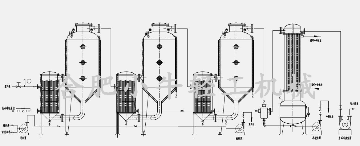 三效外循環(huán)蒸發(fā)器主要組成部件有第一效加熱器、第二效加熱器、第三效加熱器、第一效分離器、第二效分離器、第三效分離器、冷凝器、冷凝水罐、真空泵、料液泵、閥門管路系統(tǒng)、電控系統(tǒng)等。設備在運行時,料液通過泵送或真空自吸原理進入各效加熱器及各效分離器的管程,加熱介質(zhì)(鍋爐蒸汽)進入第一效加熱器的殼程,料液在真空狀態(tài)下沸點降低,當受熱到一定溫度后開始沸騰,并從噴射管噴入分離器,進行快速蒸發(fā)和汽液分離,未被蒸發(fā)的料液從底部循環(huán)管回流到加熱器再次噴入分離器,形成循環(huán)。由一效加熱器產(chǎn)生的二次蒸汽進入二效加熱器殼程,作為第二效加熱器的加熱介質(zhì),同理第二效的二次蒸汽作為第三效加熱器的加熱介質(zhì),熱能得到充分利用,從而實現(xiàn)節(jié)能效果。最后的蒸汽進入冷凝器,被冷卻循環(huán)水換熱冷凝成液相,進入冷凝水收集罐,最后排出。第二效、第三效的物料運動狀態(tài)與第一效同理,當料液縮到一定的程度,經(jīng)取樣確定合格后即可出料,完成蒸發(fā)濃縮過程。